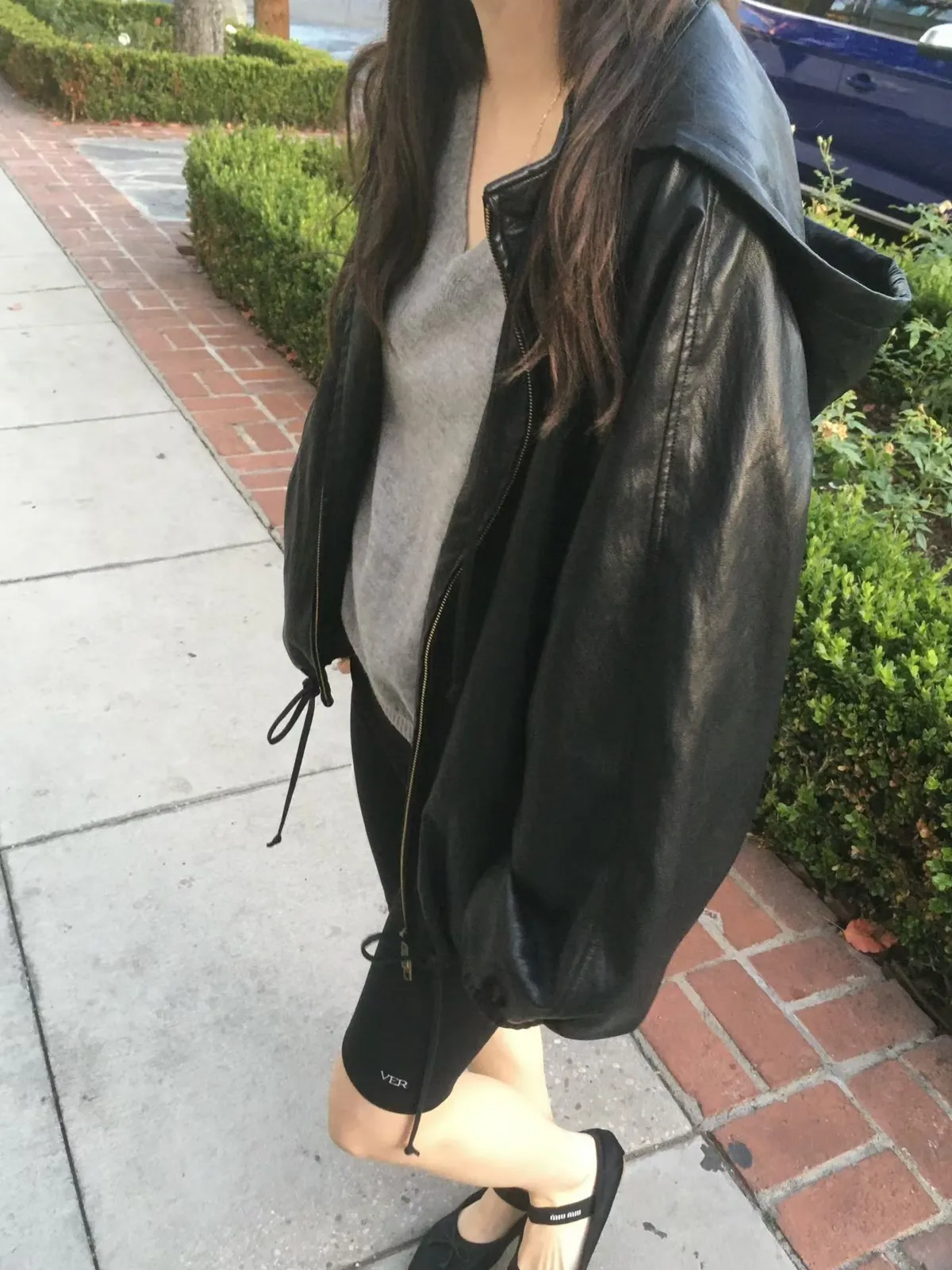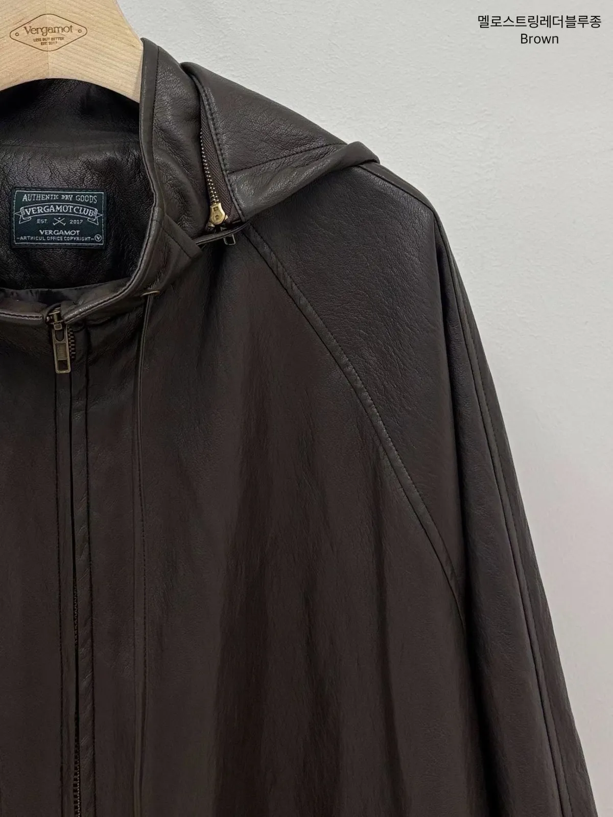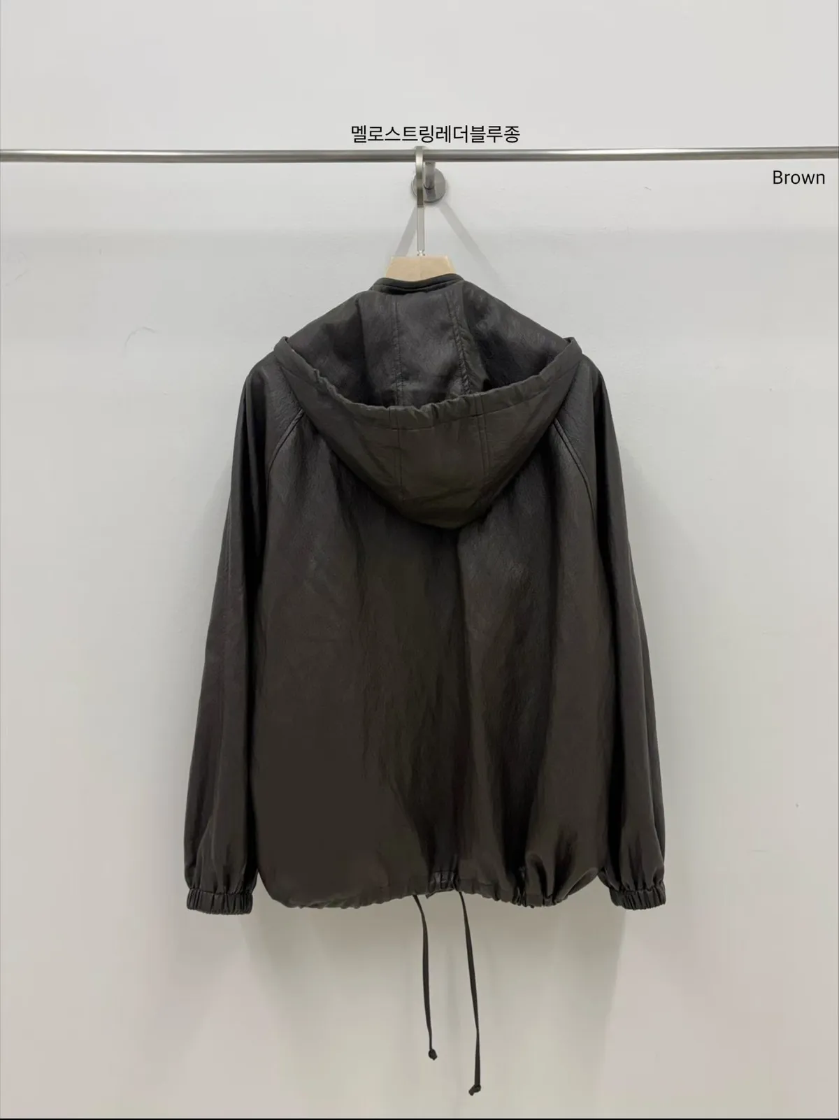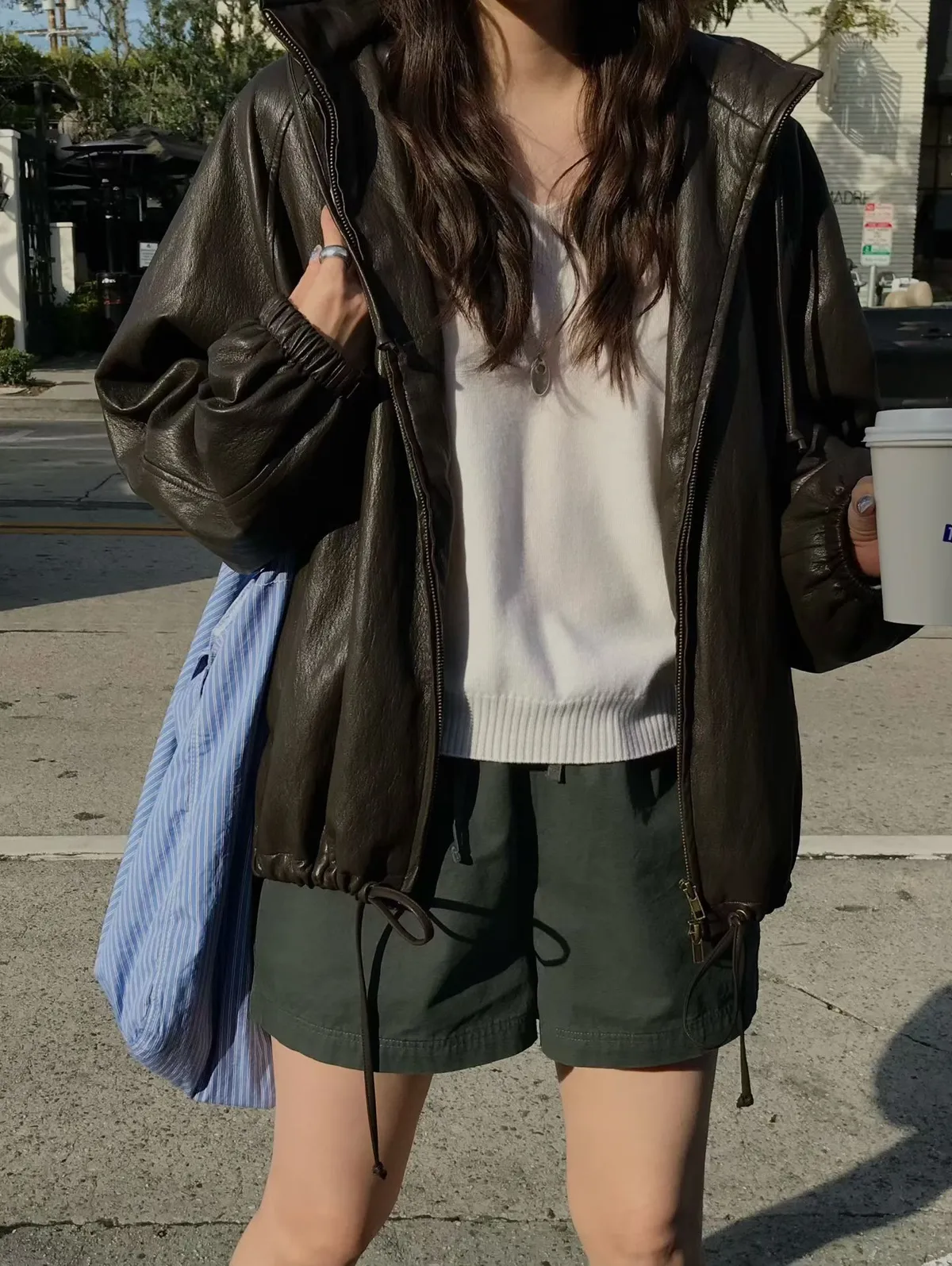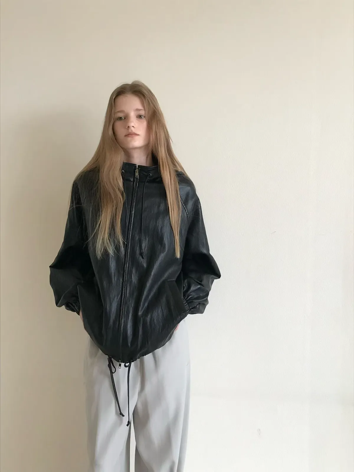 微光澤的仿舊感皮革,配上連帽與下擺抽繩設計,打破皮衣的厚重感。