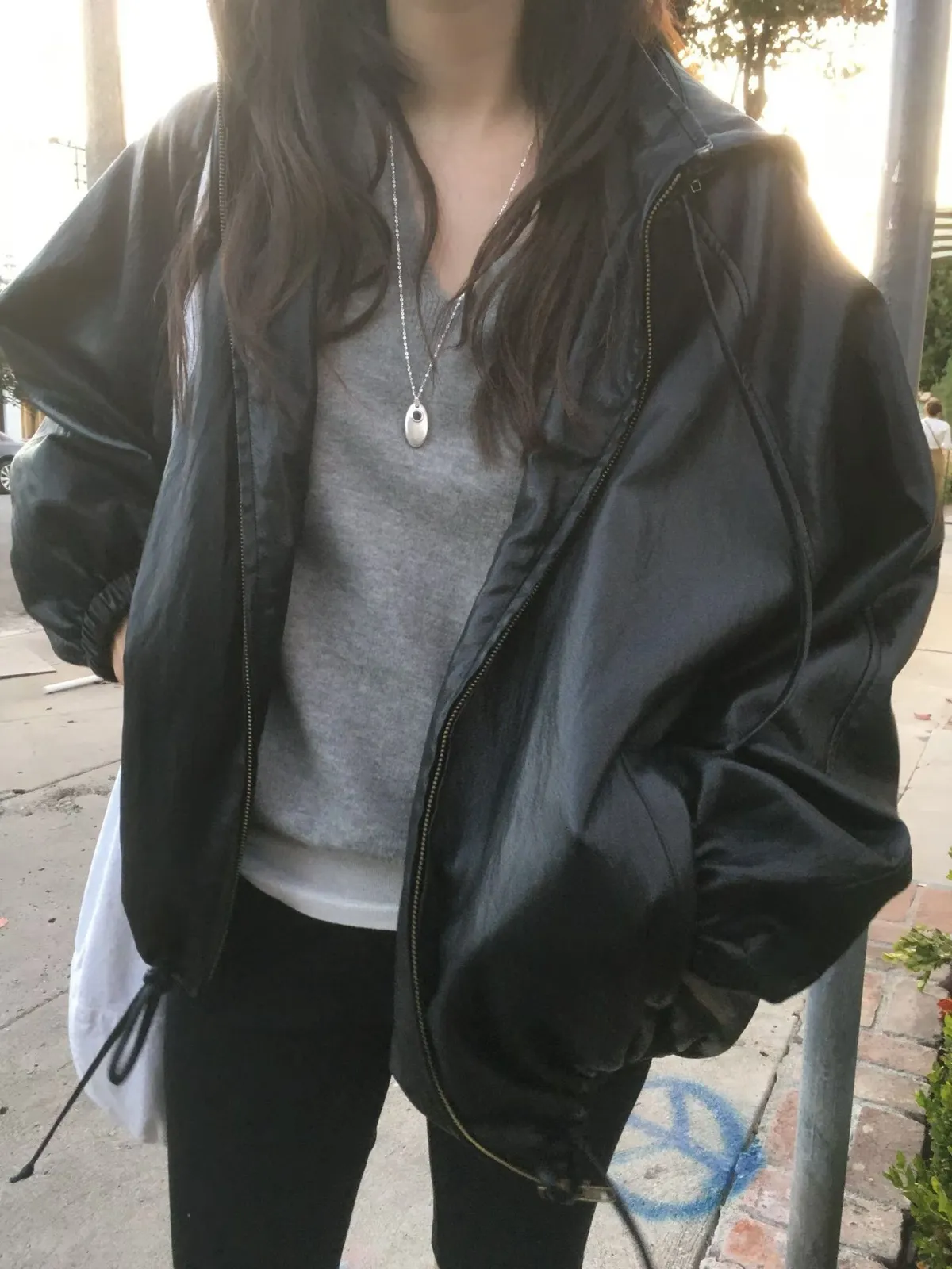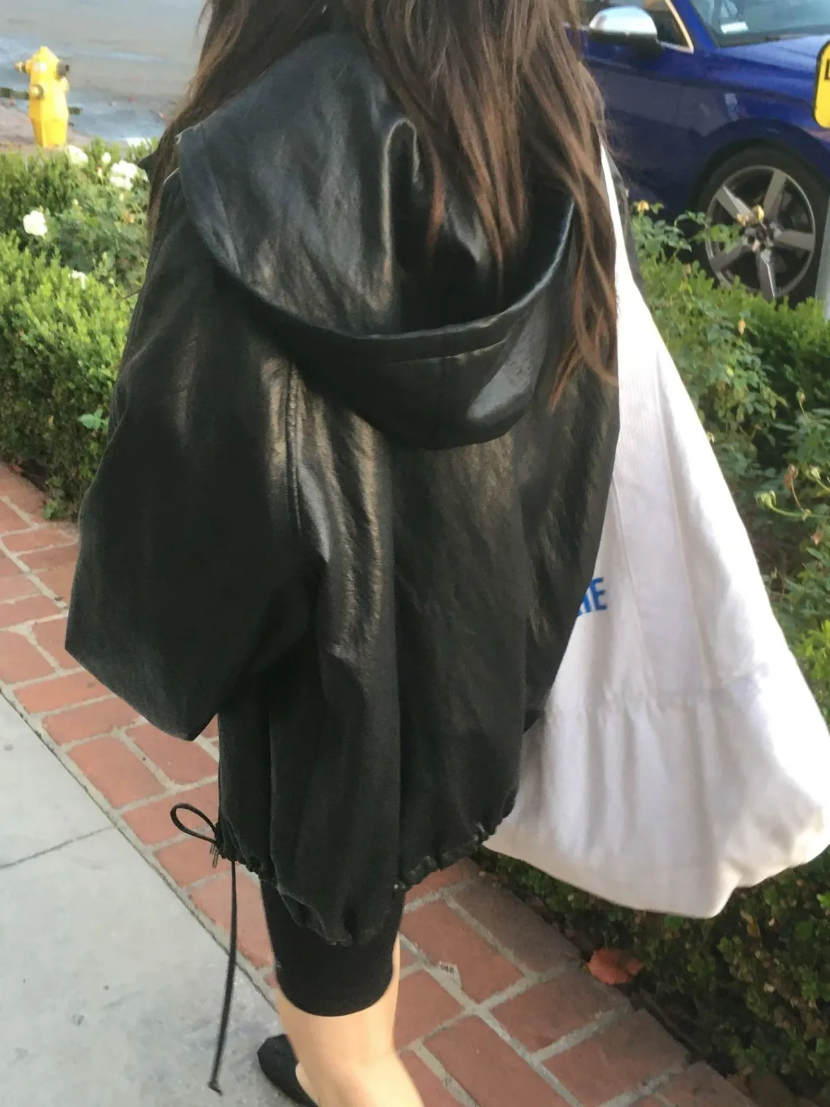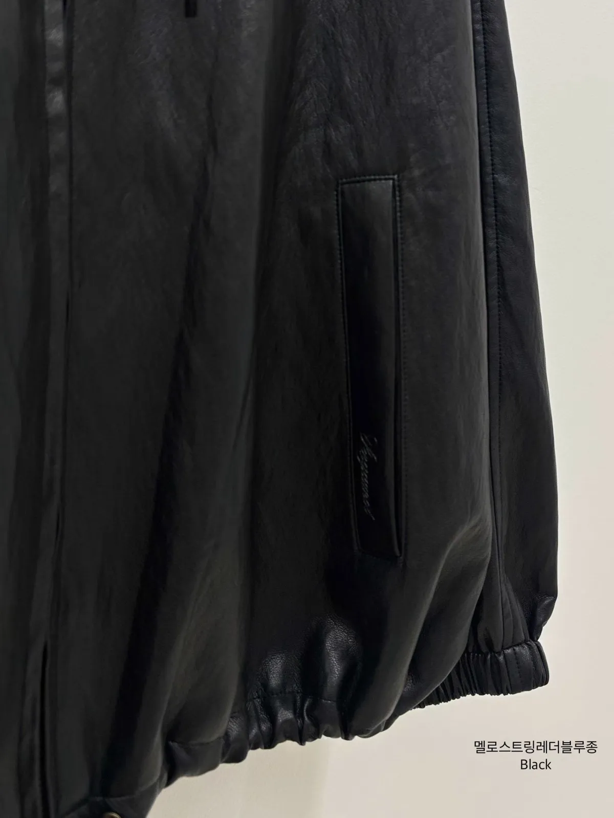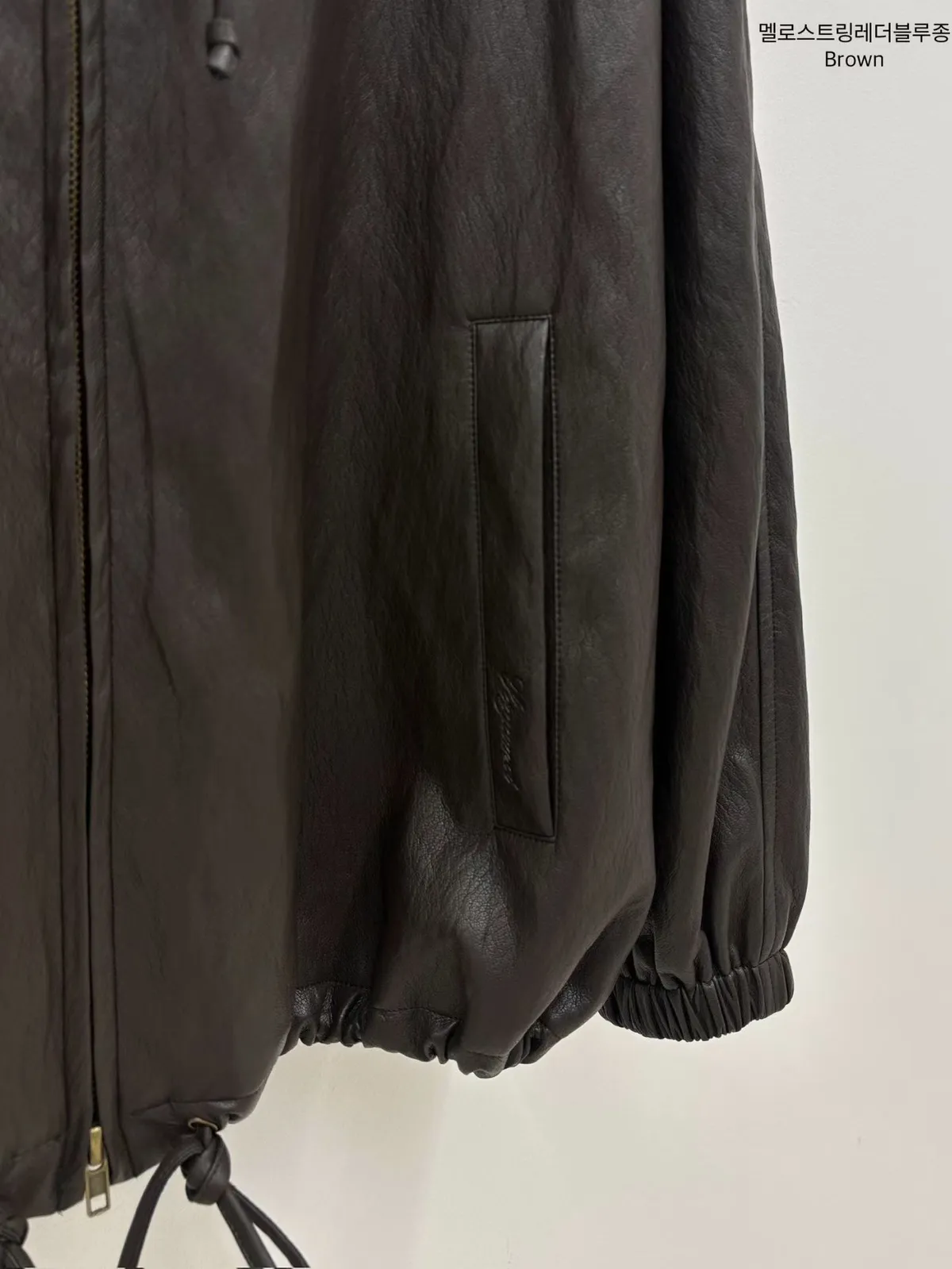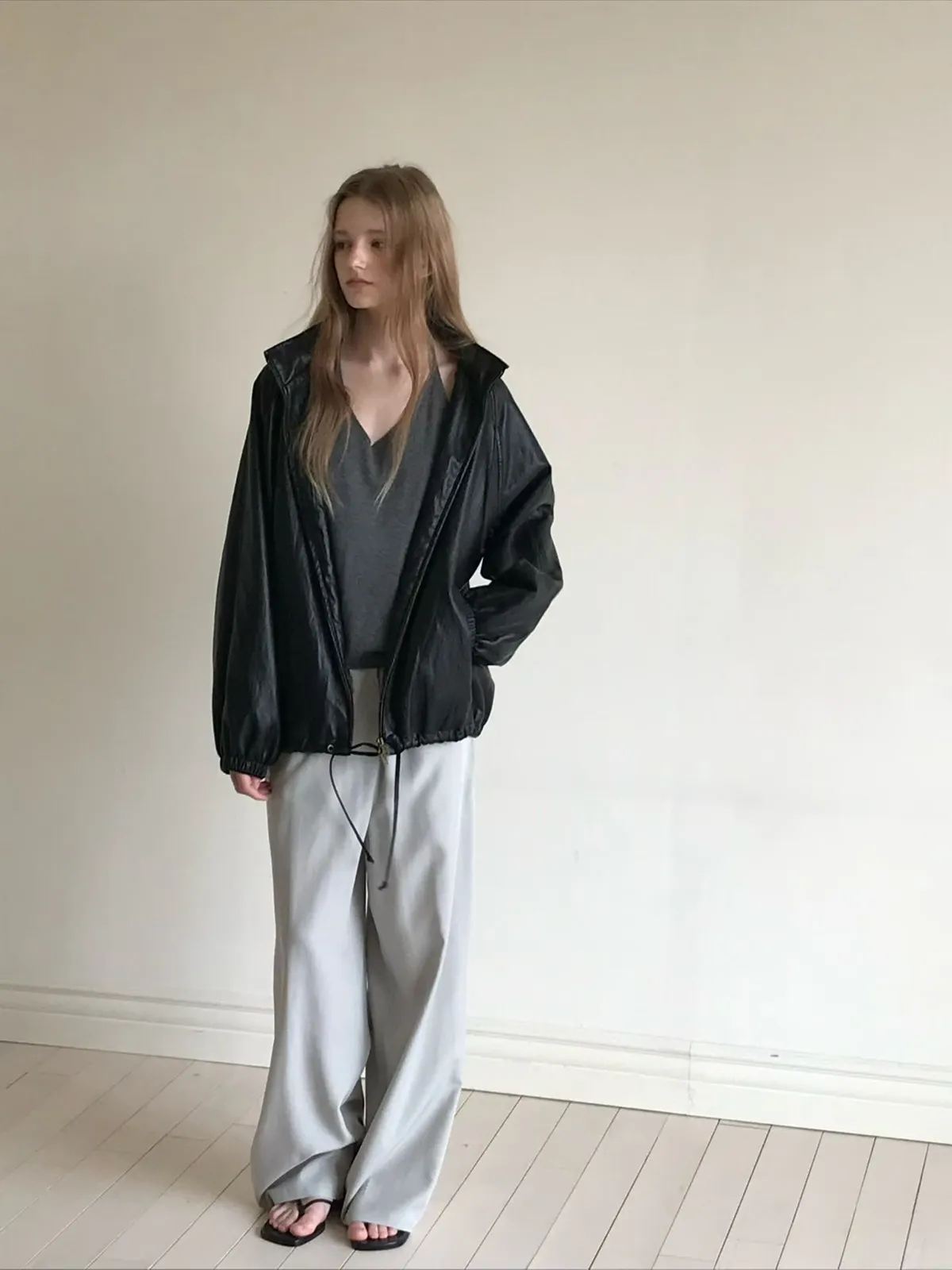 微光澤的仿舊感皮革,配上連帽與下擺抽繩設計,打破皮衣的厚重感。